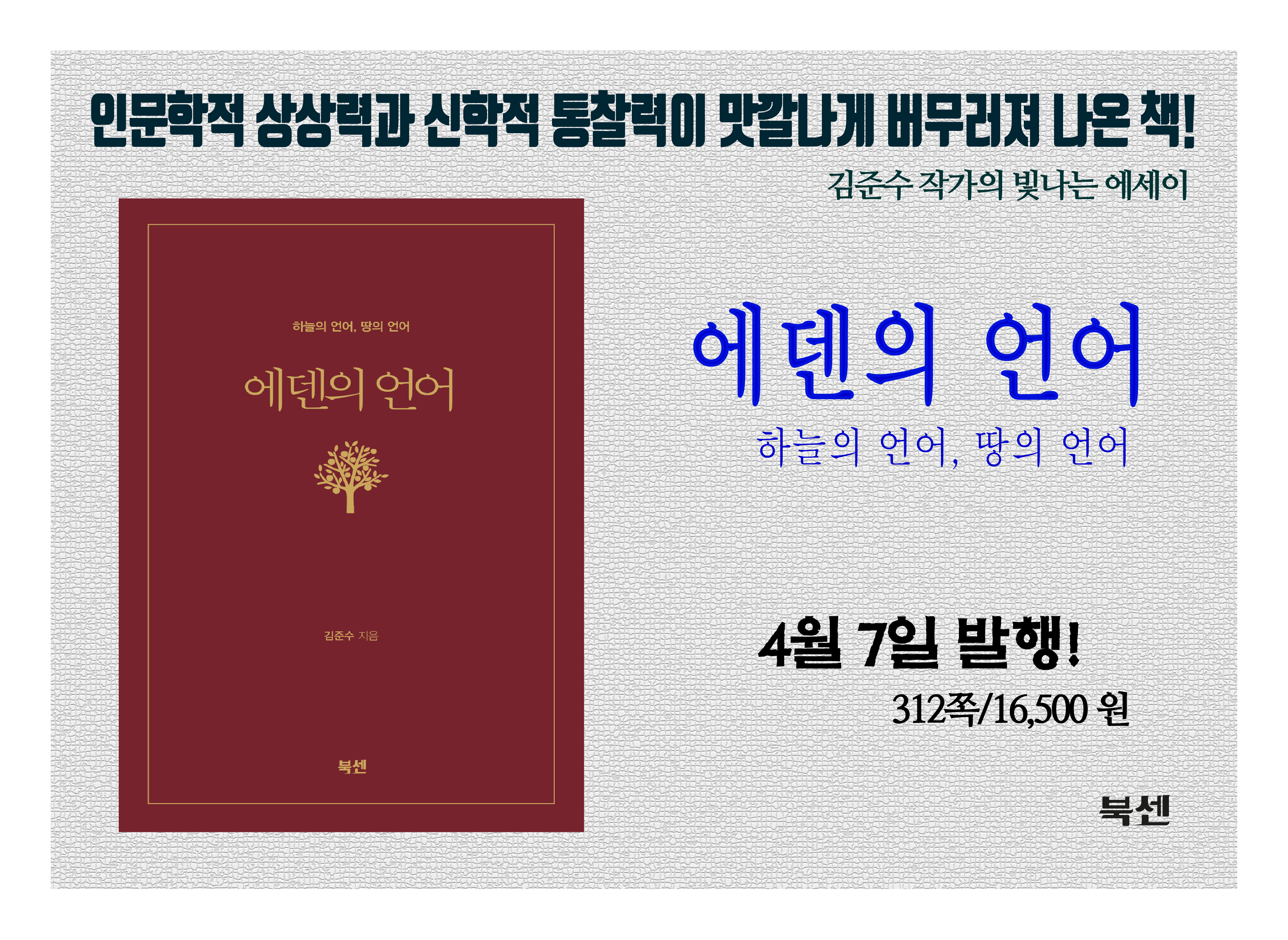 코로나19로 어디 한곳 마음 편히 나들이하지 못하는 요즘, 여름철 시원한 냉수같이 사람들의 마음을 시원하게 해줄 책을 내놓게 되었습니다. 『에덴의 언어』란 책이지요. 이 책은 언어의 기원과 분화 과정, 존재의 의미와 목적 등에 대해 인문학적, 신학적으로 사색하는 에세이 형식의 인문 교양서입니다.