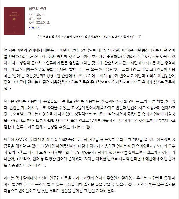 | 김준수 작가 '에덴의 언어' 출간 - 한국기독공보 (0) | 2021.04.16 |