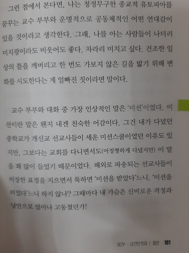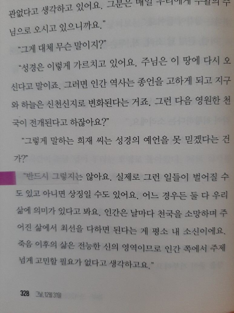 소설 후반기로 가면서 현수가 이교수와 나누는 대화들은 우리가 시대를 바라보고, 믿음에 대한 생각을 다시 하게 한다.